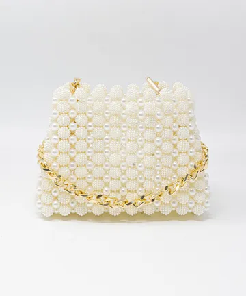 شنطة يد أنيقة من اللؤلؤ الأبيض بسلسلة ذهبية – لمناسباتك الخاصة