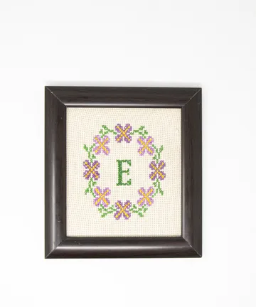برواز أنيق بإطار خشبي بني غامق وواجهة زجاجية شفافة، يتوسطه تطريز يدوي مميز لحرف ...E محاط بزهور مطرزة بدرجات البنفسجي والزهري والأخضر.