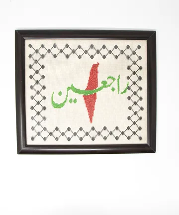 A dark brown wooden frame with a refined glass front, hand-embroidered along the... edges with the Palestinian keffiyeh pattern, featuring the Arabic word "Raje’in" in green and the map of Palestine in red at the center.