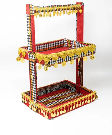 Add a touch of beauty and distinction to your special occasions with this two-ti...er basket for henna favors, crafted from luxurious traditional fabric in red, black, orange, and green. Adorned with golden coins and golden edges, it radiates elegance and heritage-inspired charm.